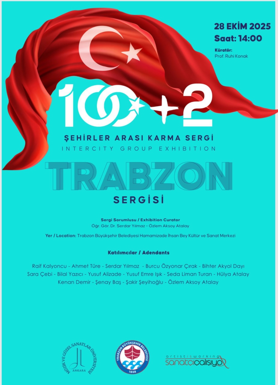 Türkiye Cumhuriyeti'nin kuruluşunun 102. yıl dönümü münasebetiyle gerçekleştirilen “100+2 Şehirlerarası Karma Sergisi” sanatseverlerle buluşuyor. Ankara Müzik ve Güzel Sanatlar Üniversitesi, Sanat ve Tasarım Fakültesi, Geleneksel Türk Sanatları Bölümü tarafından, Prof. Ruhi Konak küratörlüğünde Türkiye Cumhuriyeti'nin 102. kuruluş yılı kapsamında düzenlenen "100+2 Şehirler Arası Karma Sergi", Ankara, Adıyaman, Antalya, Balıkesir, Bitlis, Düzce, Eskişehir, İzmir, Kars, Kırıkkale, Kilis, Kocaeli, Konya, Samsun, Sakarya, Tokat, Trabzon ve Van illerinde 27 Ekim - 7 Kasım 2025 tarihleri arasında eş zamanlı olarak gerçekleştirilecektir.