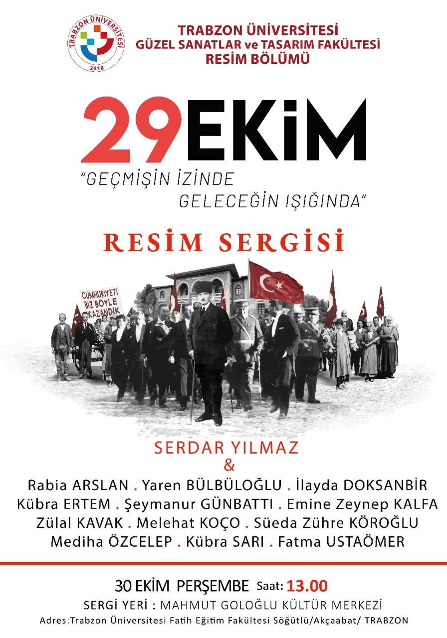 Trabzon Üniversitesi Mahmut Goloğlu Kültür Merkezi'nde, 30.10.2025 tarihinde saat 13.00 'da, Fakültemiz akademisyenlerinden Öğr. Gör. Dr. Serdar YILMAZ ve atölye öğrencilerinin çalışmalarından oluşan 29 Ekim "Geçmişin İzinde Geleceğin Işığında" başlıklı resim sergisi açılışı gerçekleştirilecektir.